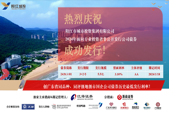 2024年1月19日,市城投集團(tuán)在深圳證券交易所成功發(fā)行“陽(yáng)江市城市投資集團(tuán)有限公司2024年面向?qū)I(yè)投資者非公開(kāi)發(fā)行公司債券”。本期債券發(fā)行規(guī)模為5.5億元,期限為5(3+2)年,票面利率3.10%,全場(chǎng)認(rèn)購(gòu)倍數(shù)超過(guò)4.8倍,是...